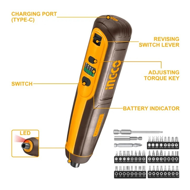 Descripción ATORNILLADOR INALAMBRICO INGCO 4V SIN CABLE USB C/43 ACCESORIOS #CSDLI04062 4V, vástago hex 1/4" Velocidad sin carga 240/min. máx.torque 5Nm Luz de trabajo integrada Indicador de nivel de carga (se carga mediante cable USB, no incluido) Caja plástica 1 Adaptador 1 Punta Cr 50mm Punta PZ : PZ0, PZ1, PZ2, PZ3 Punta Cruz : PH0, PH1, PH2, PH3 Punta Paleta: 3,4, 5, 6 mm Punta Cuadrada : S0, S1, S2, S3 Punta Spanner: SP4, SP6, SP8, SP10 Punta TriWing :TW1, TW2, TW3, TW4 Punta Hexagono : H2, H3, H4, H5 Punta Torx: T10, T15, T20, T25 Punta Torx Tamper: TT10, TT15, TT20, TT25 Punta Hex Tamper : HT1, HT2, HT3, HT4