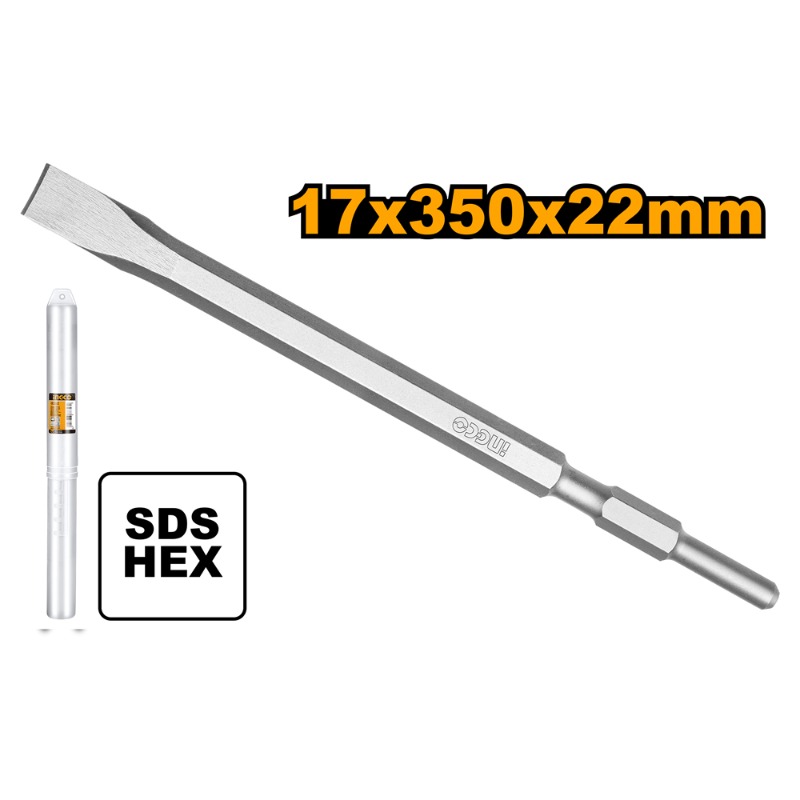 Descripción CINCEL INGCO HEXAGONAL PUNTA PLANA 17 x 350 x 22 MM # DBC0523501 Adecuado para el artículo PDB13008 (Martillo demoledor)