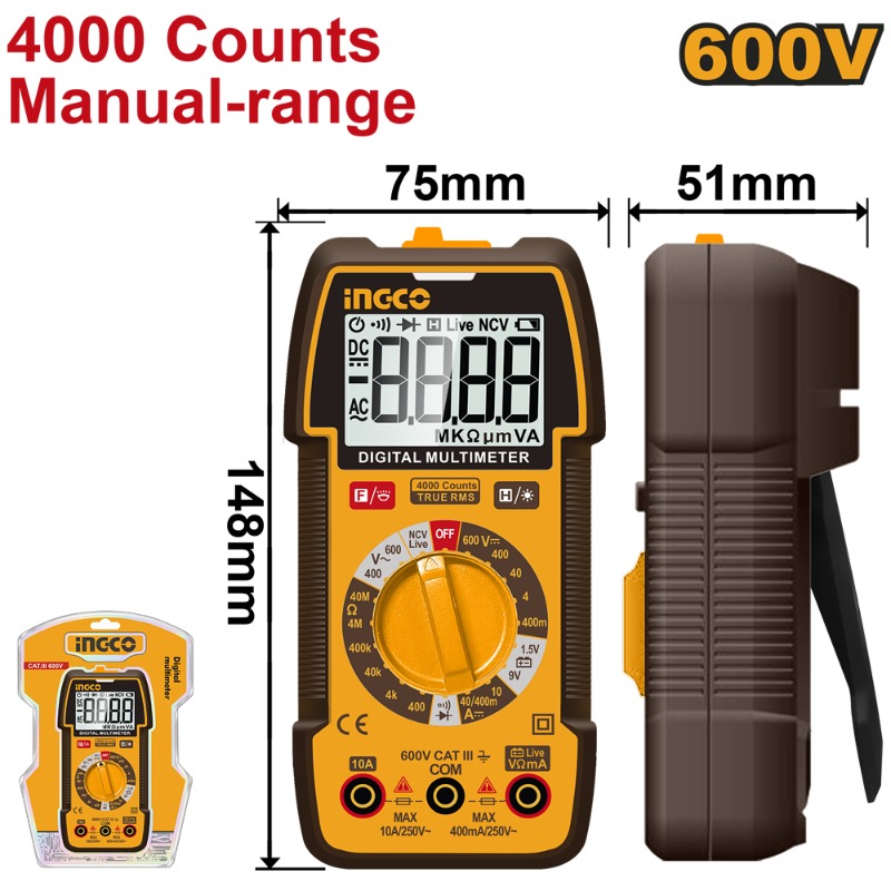 MULTITESTER INGCO DIGITAL INDUSTRIAL 600V # DM36002 Prueba de diodos - Tensión sin contacto (NCV) Retención de datos Prueba de batería Linterna - Indicación de batería baja - Retroiluminación - Con 2 pilas LR03 AAA VOLTAJE CC/CA: 400 mV/4 V/40V/600 V CORRIENTE CC: 40mA/400mA/10 A RESISTENCIA: 400Ω/4kΩ/40kΩ/400kΩ/4MΩ/40MΩ