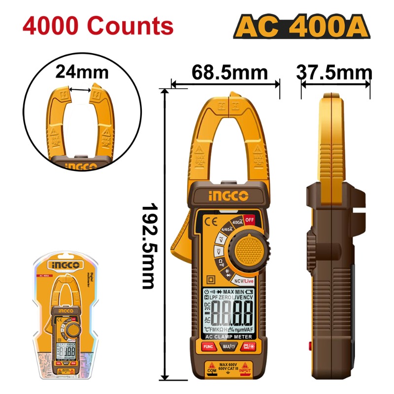 Descripción MULTITESTER DIGITAL INGCO C/PINZA AMPERIMETRICA AC-400A # DCM62001 Pantalla TRUR RMS 4000 cuentas, detección de voltaje sin contacto. Prueba de diodos. Retención de datos. Indicador batería baja. Apagado automático. Con 2 pilas R03 AAA CORRIENTE CA: 4A / 40A / 400A VOLTAJE CA: 4V / 40V / 400V VOLTAJE DC: 400mV / 40V / 400V RESISTENCIA: 400Ω / 4KΩ / 40KΩ / 400KΩ / 4MΩ / 40MΩ
