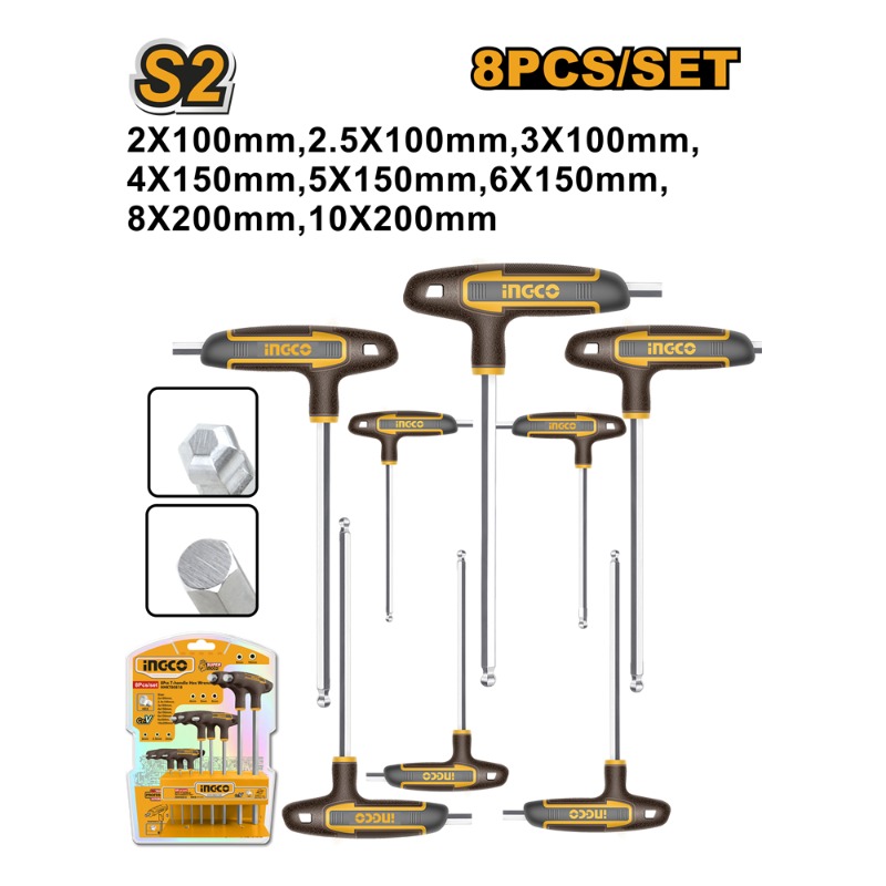 Descripción LLAVE ALLEN INGCO TIPO T PUNTA BOLA 2,5 - 10 MM JGO 8 PZ # HHKT80828 Medidas: 2,0 - 2,5 - 3,0 - 4,0 - 5,0 - 6,0 - 8,0 - 10,0 mm