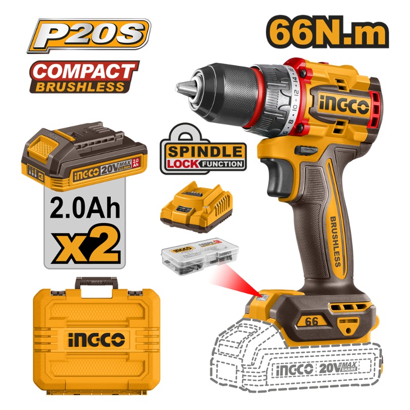TALADRO ATORN. INGCO INALAMBRICO S/ESCOBILLAS 20V - C/2 BAT.2.0 AH Y 1 CARGADOR # CDLI20668 VELOCIDAD SIN CARGA: 0-500/0-2000 rpm MAX.TASA DE IMPACTO: 30000 bpm MAX.TORQUE: 66NM CAPACIDAD DE PERFORACION: 13 mm AJUSTES DE PAR: 22+1 VOLTIOS DE CARGA: 220V-240V~50/60Hz Motor sin escobillas Engranaje mecánico de 2 velocidades. 2 baterías litio 2.0 Ah (FBLI20011) 1 cargador (2amp x hr) (FCLI2001) Función bloqueo del eje Portabrocas metálico sin llave Bloqueo automático Luz de trabajo integrada Indicador LED de carga de batería 3 brocas para mampostería 47 accesorios Caja plástica